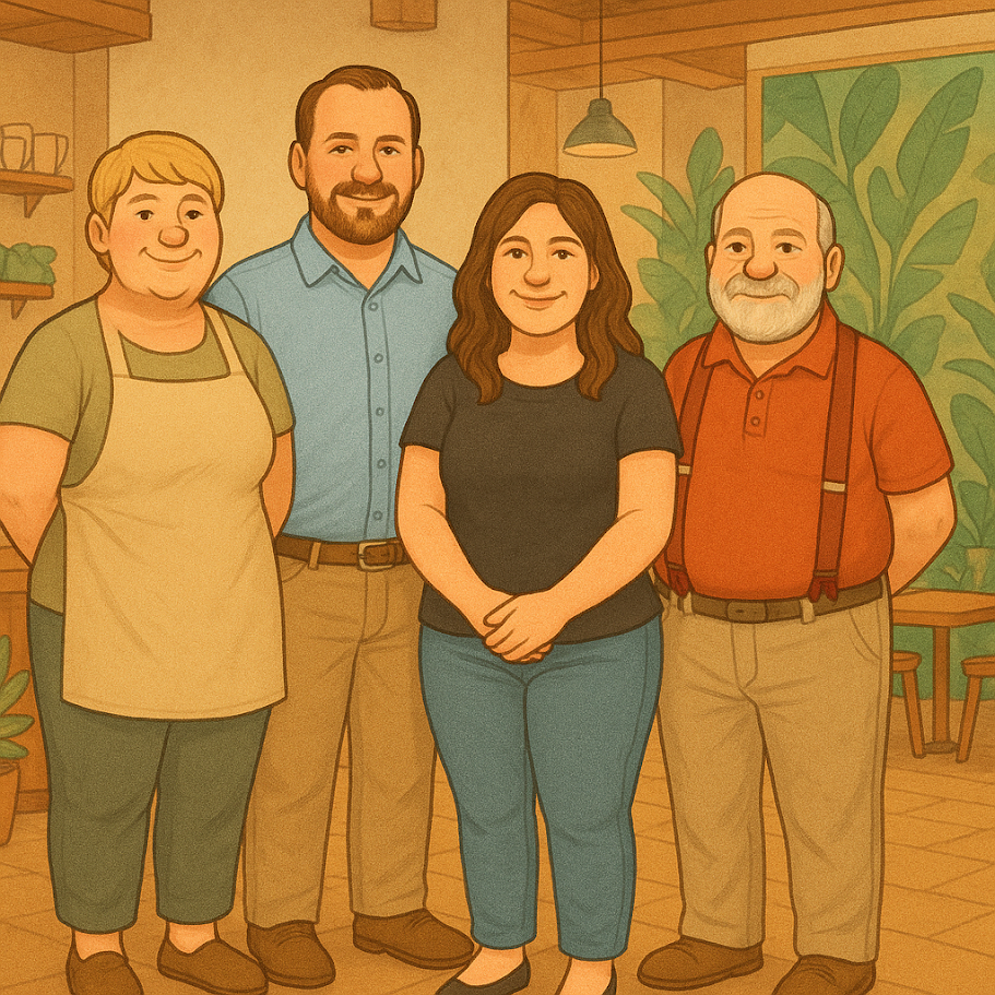 Za Veselou kavárnou stojí manželé Veselí a malý tým zaměstnanců a brigádníků, kteří se společně starají o každodenní chod podniku.